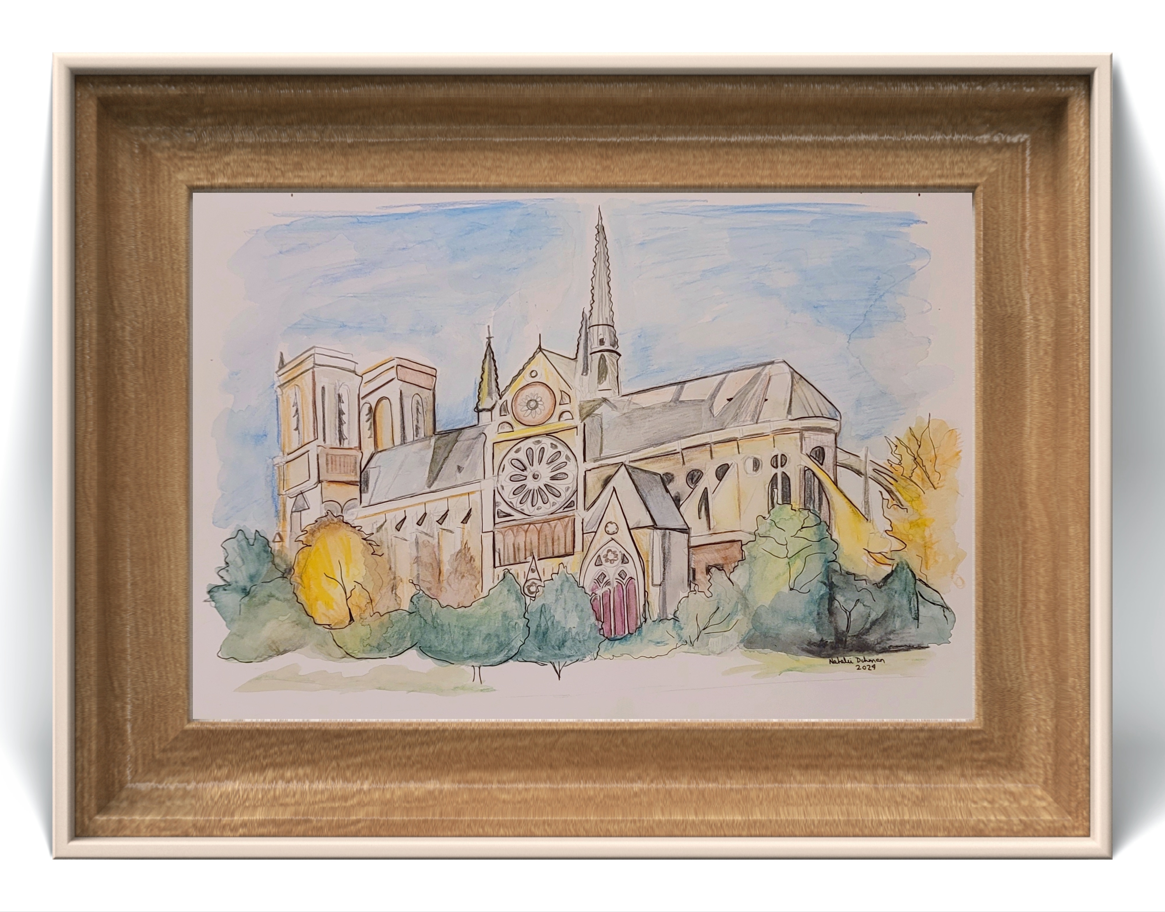 This painting of Notre Dame was done in mixed media watercolor pencil and ink and represents one of Frances most iconic structures.
